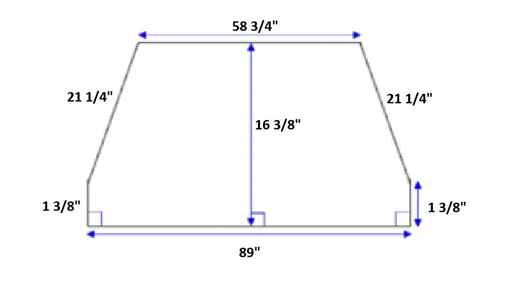 | Dimensions: | 3″ x 89″ front x 58 3/4″ back x 16 3/8″ deep x 21 1/4″ angle sides x 1 3/8″ sides